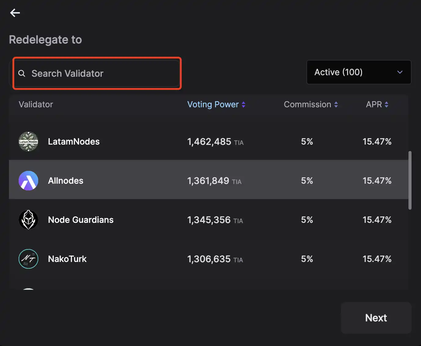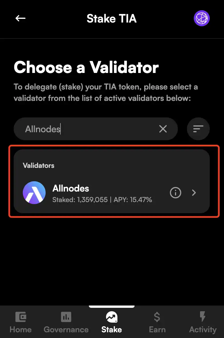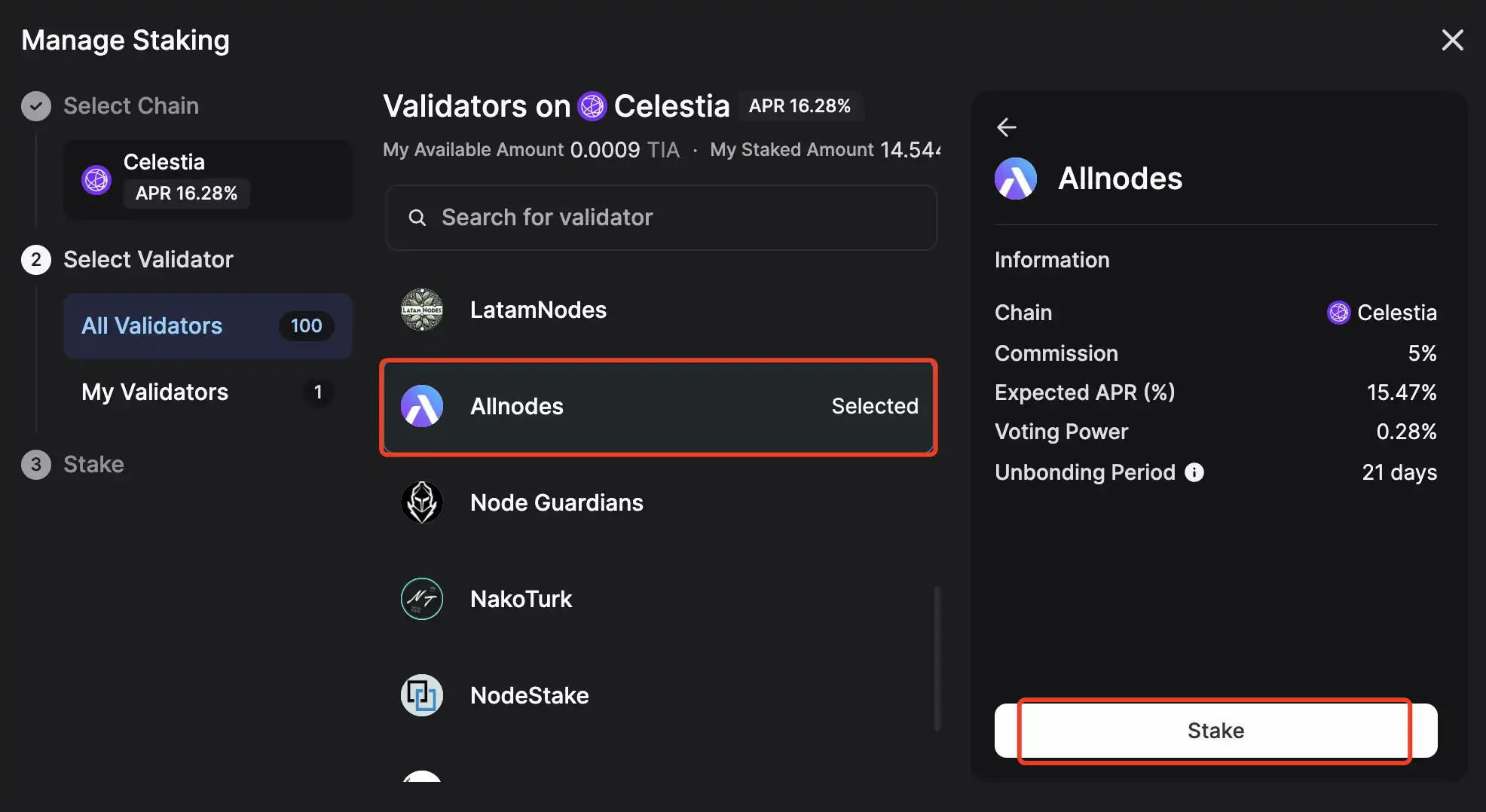 2、点击 TIA Stake,并选择验证器,此处还是以 Allnodes 为例,搜索 Allnodes 验证器并单击;输入想要质押的 TIA 数量,然后单击「Review」,确认交易。