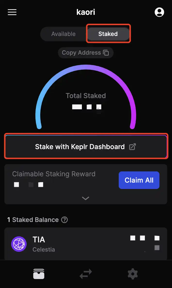 1、打开 Keplr 钱包 Staked 界面,选择 Stake with Keplr Dashboard;