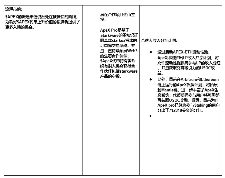 从 ApeX 当下业务的发展的速度,生态建设上的构建深度,以及公开的充满潜力的产品发展路线图上来看,其代币的上涨正是项目的价值开始彰显的表现。而其代币模型中的质押计划,LP 分红计划等都将更多的项目收益绑定给了代币持有人,截止到目前,平台已经分出了 712,818 美元给到参与用户。这些举措都加快了其代币内在价值的铸造速度,而 ApeX 即将推出的代币回购和销毁计划更是通过紧缩的代币模型增强了其代币的稀缺性。这些因素无疑都推动了 ApeX 代币的价格暴涨。另外,更具吸引力的是 ApeX 拓展了不少生态合作伙伴的深度合作,ApeX 代币持有者有很大的机会获得其合作伙伴包括 starkware 产品后续的空投。还值得关注的是,对比同类产品 dYdX 和 GMX 的市值都过 5 亿美金,APEX 市值现在只有 5000 万美金左右,其未来价值潜力不容低估。