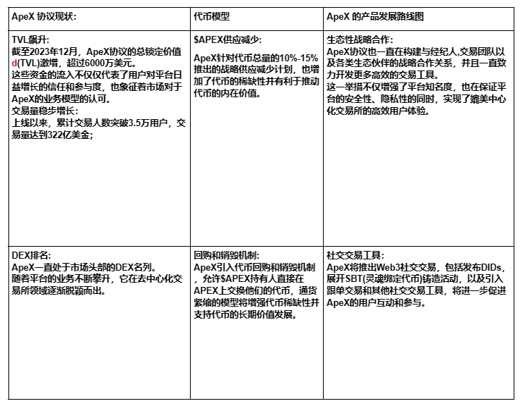 作为 dex,ApeX Pro 通过提供订单薄模型的永续合约交易模式,实现了用户高效的交易体验。同时交易者的资产完全处于链上,由交易者自己控制私钥,ApeX 通过非托管资产的方式保证了用户资产安全。并且依托于 StarkWare ZK Rollup 拓容和安全方案,ApeX 实现了链下链上数据一致性和完整验证,确保了用户交易的安全性和隐私保护,是 ZK 赛道里的一个完整的多链应用产品。对比同类产品 dYdX 和 GMX,ApeX 增加了挖矿奖励回购以及推荐奖励等机制,以及提供了更优惠的交易费率,发展潜力更充满了想象空间。