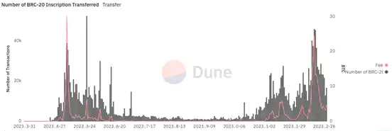 • BRC 20 : 累计 BRC-20 转账数量超过 45.4 million, BRC-20 累计产生的手续费超过 4,290 BTC;
