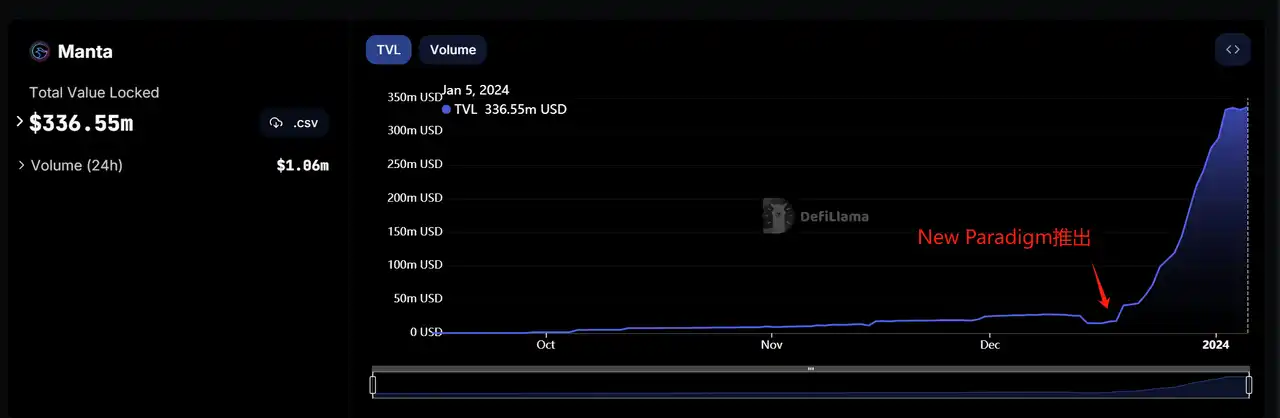 下图为 Manta 的链上 Defi TVL 走势,能看到明显的增长拐点在 new paradigm 推出后。