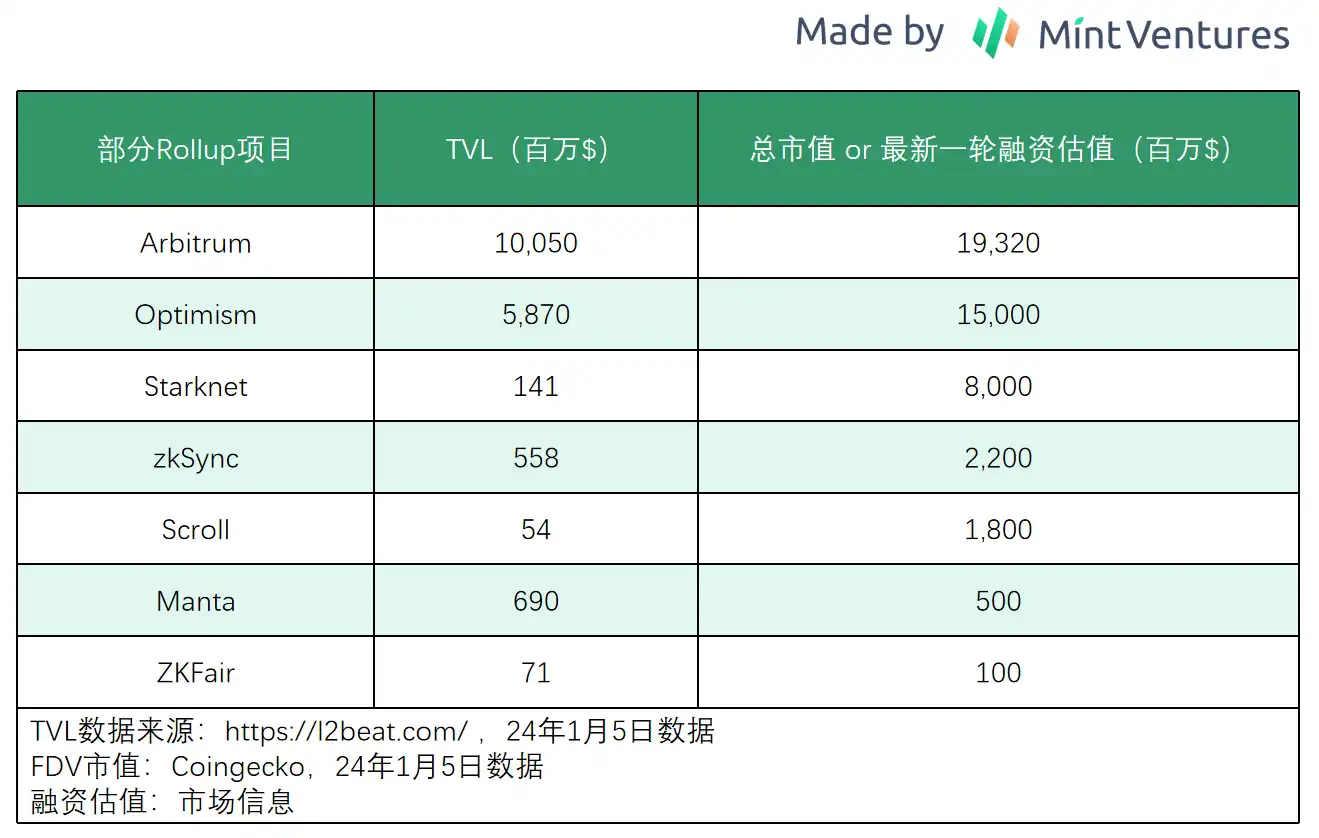 Rollup 本身并不是新物种,已经上线的 Rollup 包括 Arbitrum、Optimism 都已经有了庞大的市值和业务体量,其他的 ZKRollup 如 Starknet 和 zkSync 也已经运行多时。