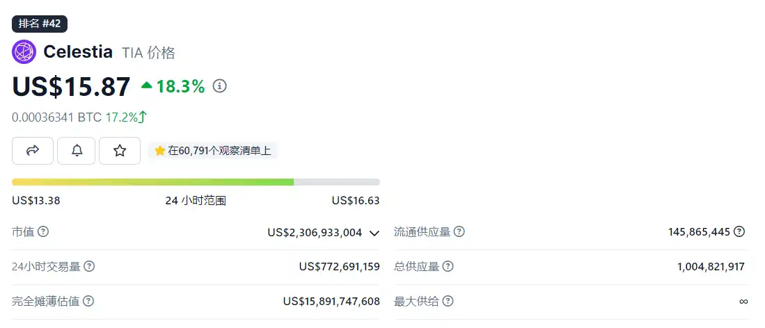 由此可能会出现「Celestia 是 Rollup 时代的以太坊」的子叙事,未来这个故事是否能成真,短期来看并不重要,因为从 Celestia 目前仅 23 亿$的流通市值来看,其距离以太坊的 2700 亿$的流通市值足足有两个数量级的空间。