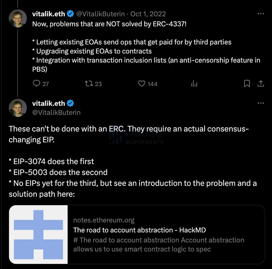 对此,以太坊社区针对以太坊路线图展开激烈讨论。加密研究员 FRANCESCO 深入讨论了其关注的 ERC 和 EIP,并分析了各提案的优势。他认为,尽管以太坊的发展通常被认为较为缓慢且受控以优先考虑安全性,但以太坊并未保持静止,其中 ERC-4337、EIP-4844、EIP-3074 和 EIP-5003 的实施在这一演进旅程中发挥了至关重要的作用。 将原文编译如下: