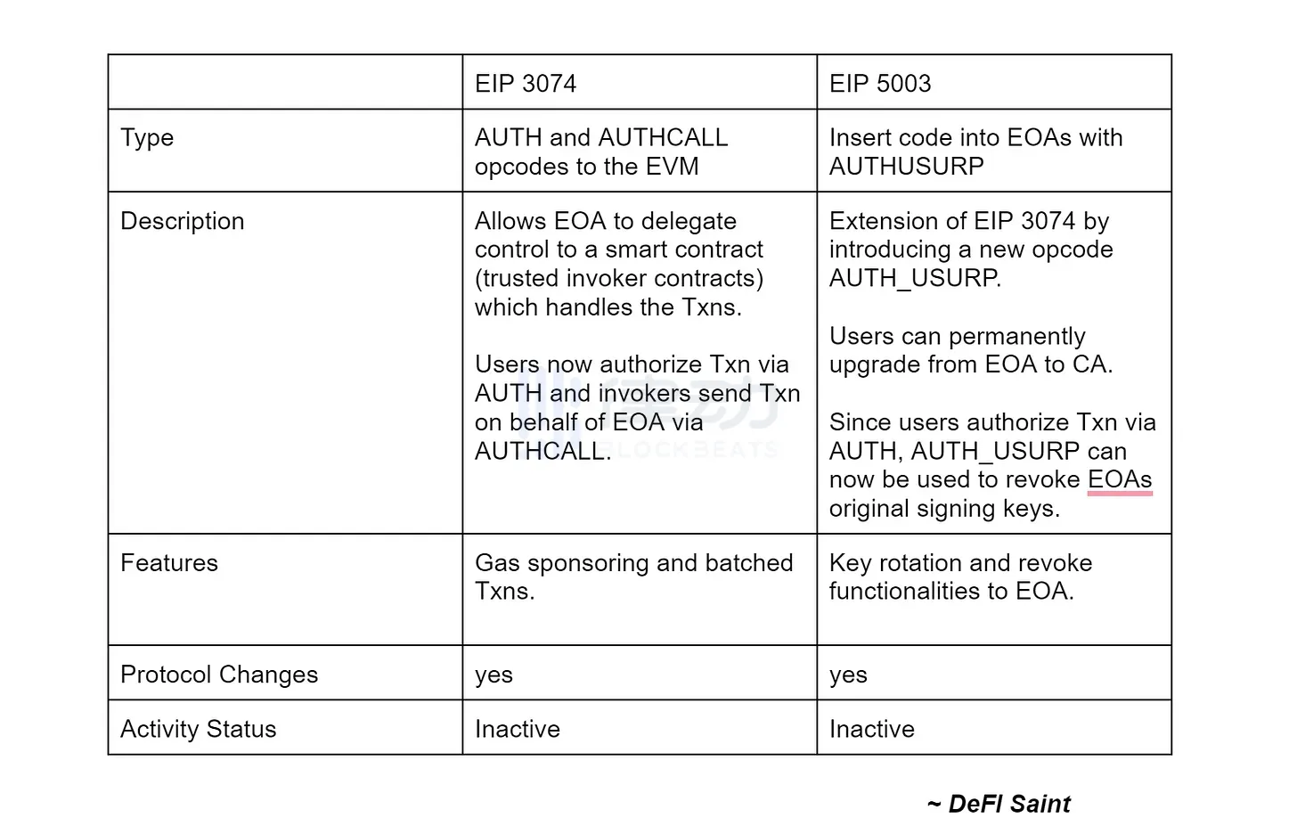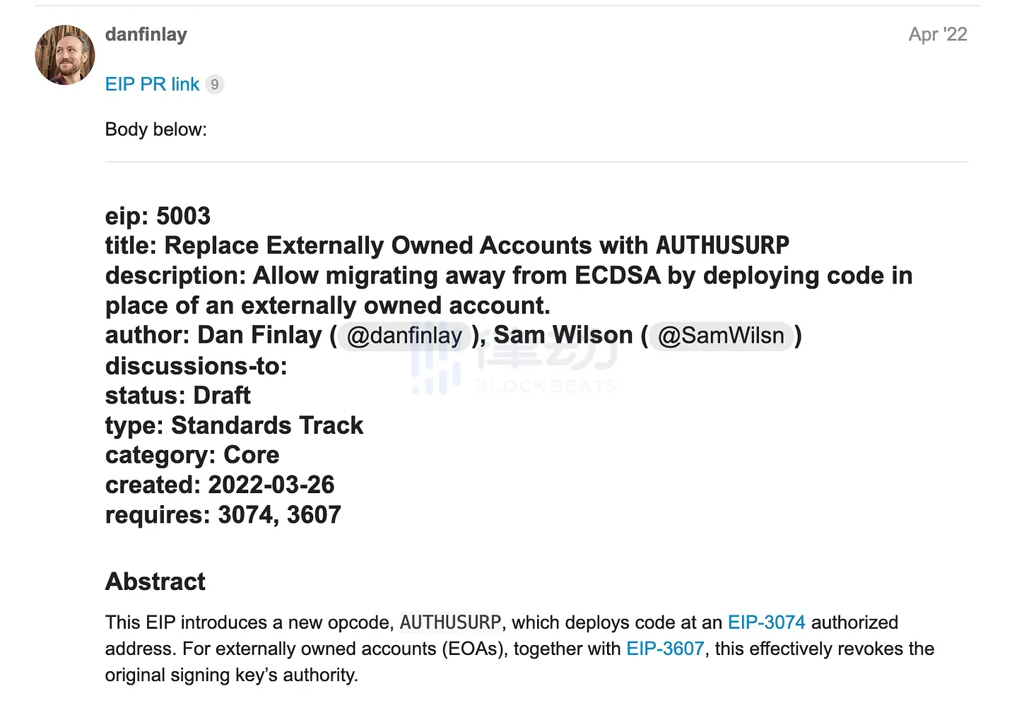 虽然 EIP-3074 授权智能合约,但 EIP-5003 完全将以太坊 EOA 账户的签名密钥迁移到智能合约账户。