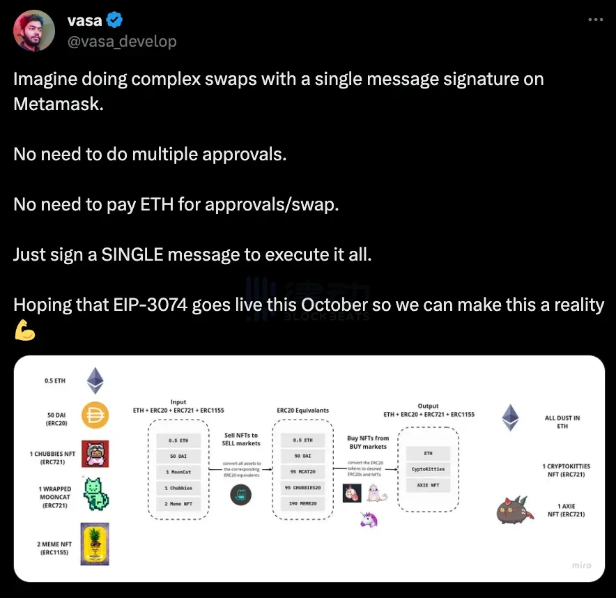在实践中,EIP-3074 将允许使用单一签名执行复杂操作,无需多次批准,极大地改善了用户体验,同时实现了复杂操作的无缝执行。