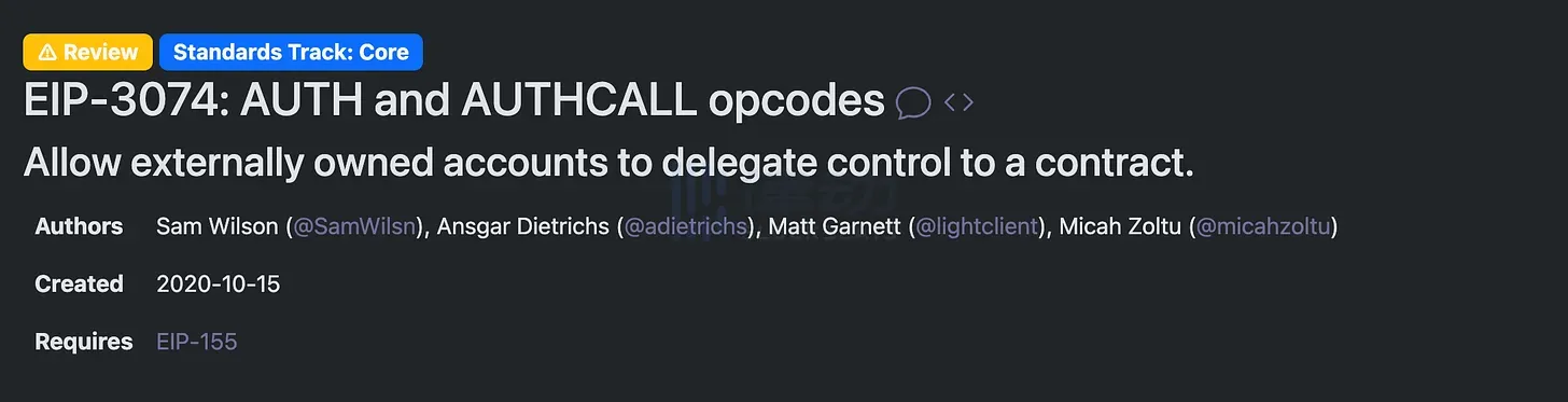 EIP-3074 旨在更新以太坊的 EOA,使其能够将控制权委托给智能合约,从而使智能合约能够批准起源于用户账户的交易。
