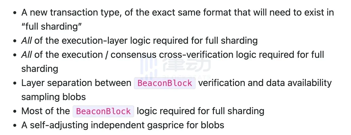 解决方案:引入了「携带 blob 数据的交易」的新事务格式。它包含大量「无法通过 EVM 执行访问,但其承诺可以访问」的数据。与将完整内容嵌入主体不同,blob 的内容是分开传播的,作为「旁路」。
