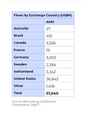 根据数字资产发行机构 CoinShares 每周统计全球各个地区合规加密资产产品的资金流动情况,数据包含各大机构发行的、投资于加密资产的、在传统金融渠道交易的产品,包括各类 ETP(Exchange Traded Products,交易所交易产品)和信托产品。该数据能够提现传统金融的资金,尤其是机构投资者资金对加密资产的投资资金进出情况,最新一期的数据截止于 2023 年 12 月 31 日。其中根据交易所在地区划分,各个地区的资管规模为: