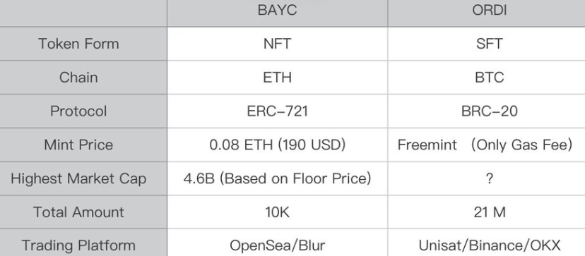 $ORDI 是 BTC 生态的第一个 SFT 代币,本身则是 MEME 属性,所以并没有 Intrinsic 估值模型,换句话说,唯一的限制就是你的想象力。但我们仍旧可以通过回顾 NFT 市场的龙头 BAYC 来做一个预估。