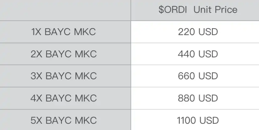 BAYC 一直以来是 NFT 代币的龙头项目,类似于公平发售(低价 Mint),然后上涨上千倍,在 2022 年的 5 月达到最高市值约 46 亿美金。$ORDI 做为 BRC-20 的第一个代币,只需要付出一点 Gas 即可免费 Mint,然后上涨上千倍,目前的价格(2023 年 12 月)稳定在 70 美金。我们假设 ORDI 在未来继续保持 SFT 代币的龙头地位,那么牛市最高点至少可以对齐 BAYC 的市值,此时的单价是 220 美金,但因为$ORDI 可以在中心化交易所交易,流动性远高于 BAYC 这样的 NFT(很多单纯炒币的玩家只会中心化交易所交易而不会使用钱包),那么总市值达到 BAYC 的 3-5 倍,也是可以接受的,所以我们有了下表: