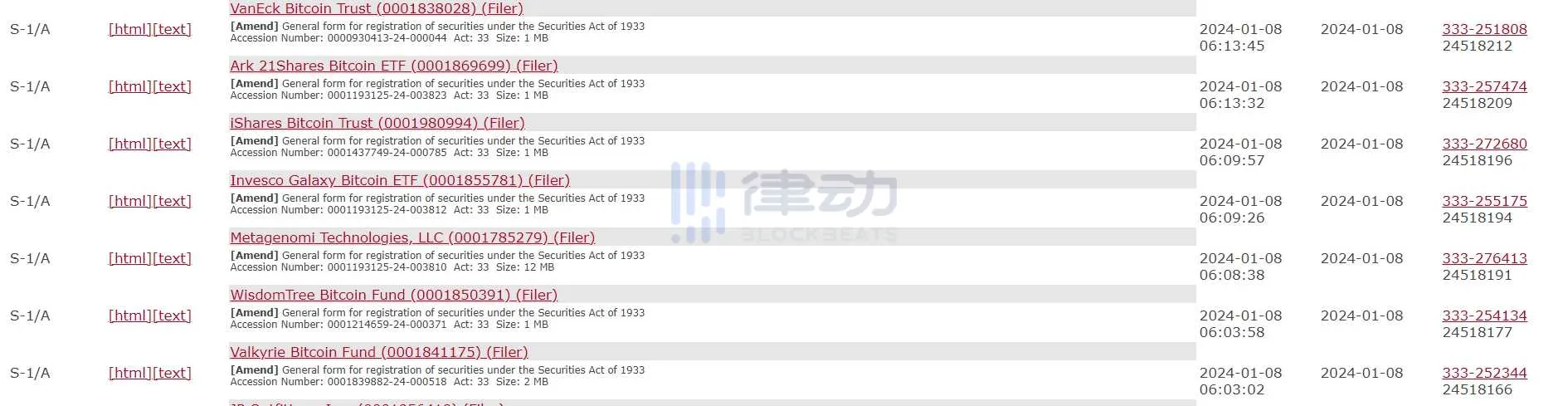 消息,1 月 9 日,据 The Block 报道,美国证券交易委员会(SEC)确认收到 Invesco Galaxy、Valkyrie、Franklin、Ark 21Shares、富达、Vaneck、Hashdex、Wisdomtree、Bitwise 等机构比特币现货 ETF 的拟议规则变更的修正案。