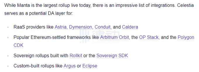 Celestia 是专门为充当 DA 网络而构建的。与目前业界最大的 DA 层以太坊主网相比,它提供的 Rollups 数据成本降低了 99.9%。