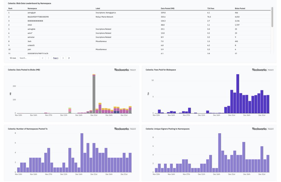 · @astroglyph_io,铭文服务,允许用户将任意数据发布到 Celestia 上 · @MantaNetwork,与 @Calderaxyz 一起启动的 OP Stack rollup · 808080808080808,一个未知的命名空间,但看起来像一个 rollup