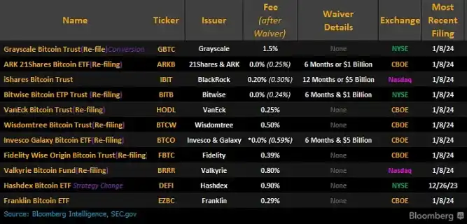 我们预计费用将成为未来新产品的一个关键差异化因素,正如目前美国现货 ETF 所体现的那样。第一批公布费用的公司是 Invesco、Galaxy,免除前六个月和前 50 亿美元资产的费用,以及富达提供 0.39% 的费用。截至 1 月 8 日,其他发行人的公告证实费用战确实已经开始: