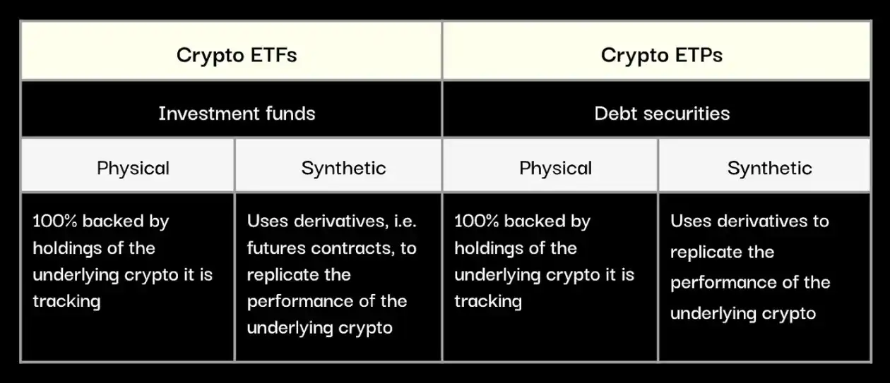 从广义上讲,加密货币 ETP 分为两种产品类别和类型:ETF 和 ETP,以及实物资产和合成资产。
