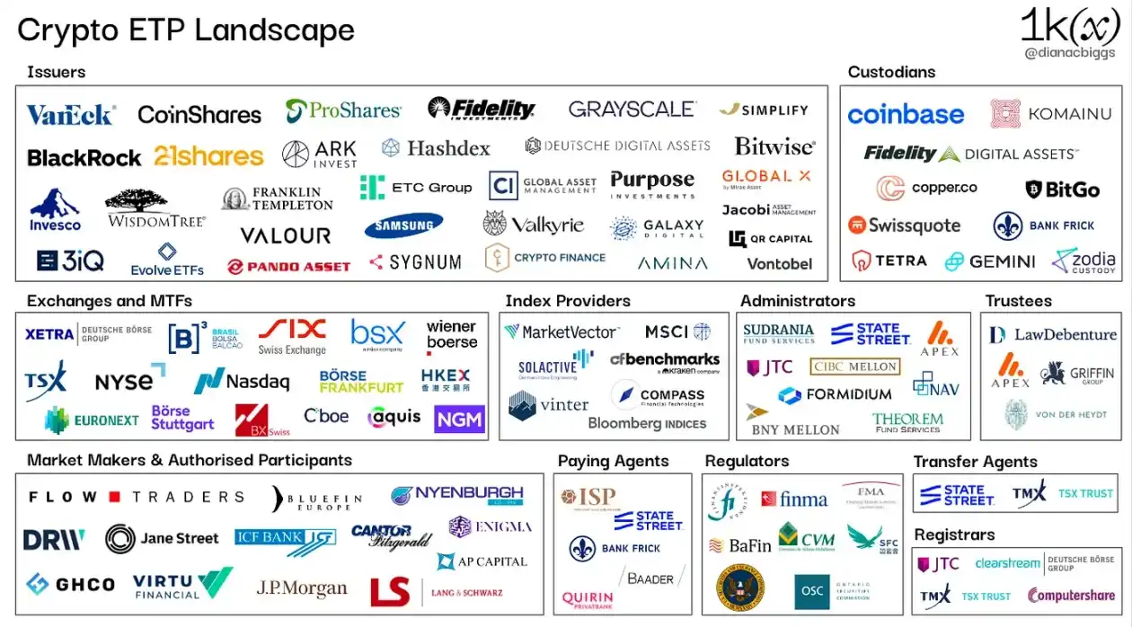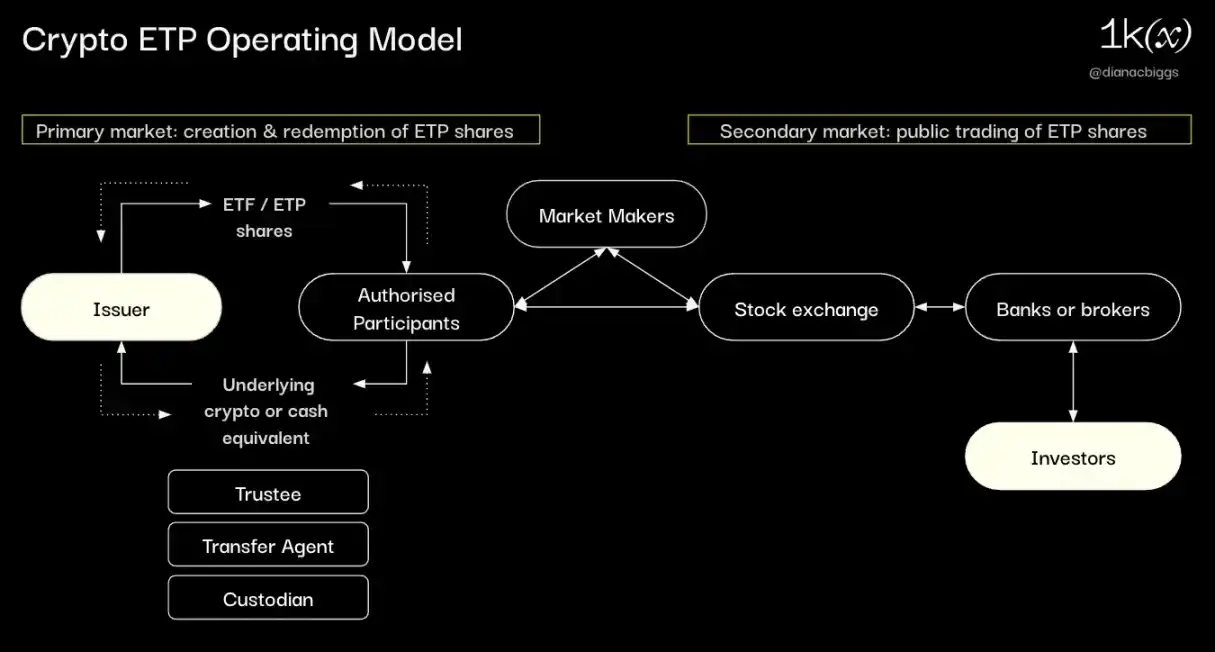 托管人持有实物支持 ETP 产品背后的基础加密货币。ETP 发行人使用的托管机构包括 Coinbase、Fidelity Digital Assets、ital Assets、 Komainu、BitGo、Copper、Swissquote、Tetra Trust、Zodia Custody 和 Gemini。