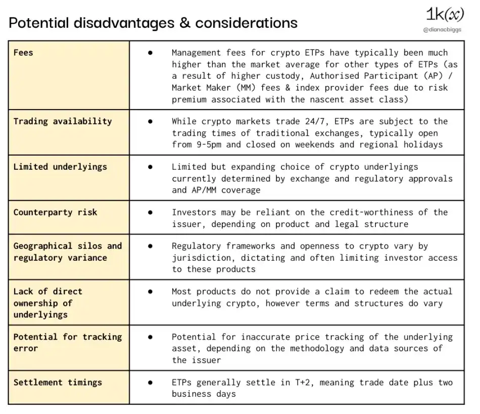 与直接购买加密货币相比,ETP 还存在潜在的缺点和考虑因素(并非所有投资者都会认为这些是缺点)。其中包括迄今为止加密货币 ETP 的费用比其他 ETP 费用高得多(尽管这些费用已经随着竞争的加剧而下降)、传统交易所与加密货币 24/7 市场相比的交易访问时间有限、交易对手、汇率风险以及结算时间等。