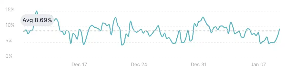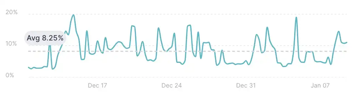 同样以 OKX 为例,目前 OKX 稳定币理财年化收益率为 8% 。在过去的 30 天里,这一数字最高飙升至 58% ,且长期处于 20% 上方。在旺盛的市场情绪下,各 CEX 的稳定币理财均是一个相对低风险的不错选择。