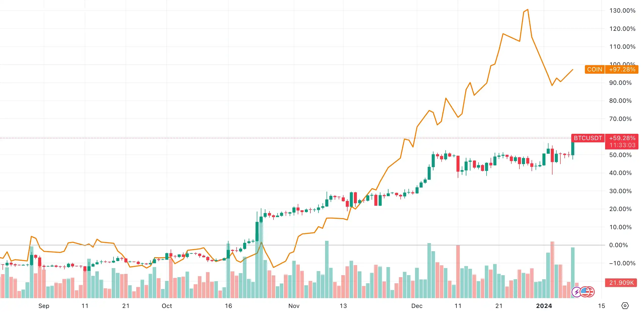 以 COIN 为代表的加密货币概念股,走势一直和加密货币大盘存在关联性。而股票市场更加成熟、简单易得的投资工具,也为我们押注加密市场提供了更多的可能性。无论你是做多、做空、做波动率,寻找一些加密板块股票作为操作标的,都是一个不错的选择。