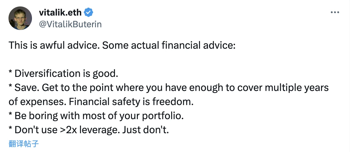 1 月 7 日,V 神在 X 平台发文,他提供了自己的投资建议:不要使用超过两倍的杠杆。千万不要。