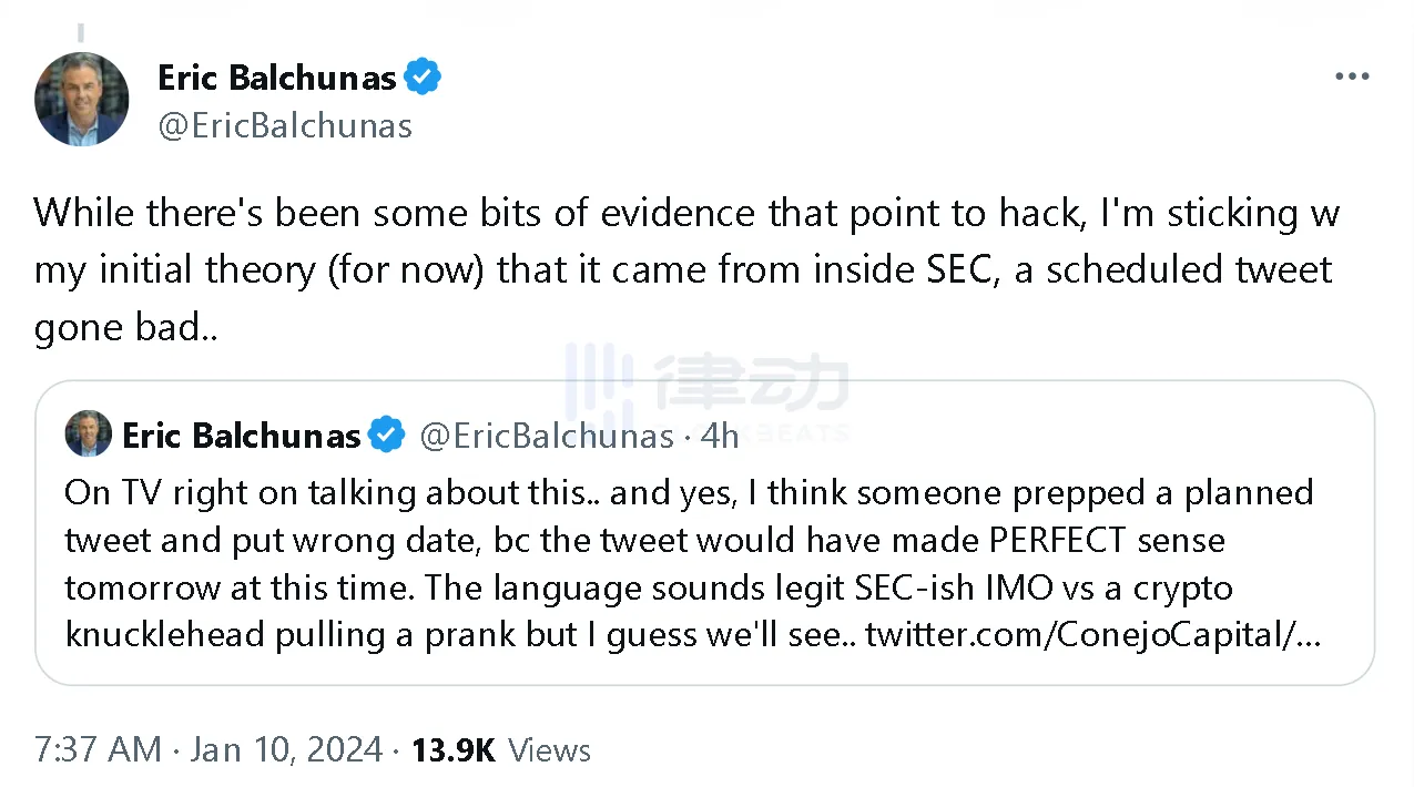 但与 Cointelegraph 报道的假消息不同,彼时多方信源出面辟谣,而这次却出现了不同的声音。其中,彭博分析师 Eric Balchunas 在其社交平台表示,尽管有线索指向 SEC 官推被盗,但其更倾向于认为该不实消息来自于 SEC 内部,或为「SEC 员工准备了一条计划好的推文但输入了错误的日期」,因为推文用词很符合 SEC 风格,所以不是一个简单的恶作剧。