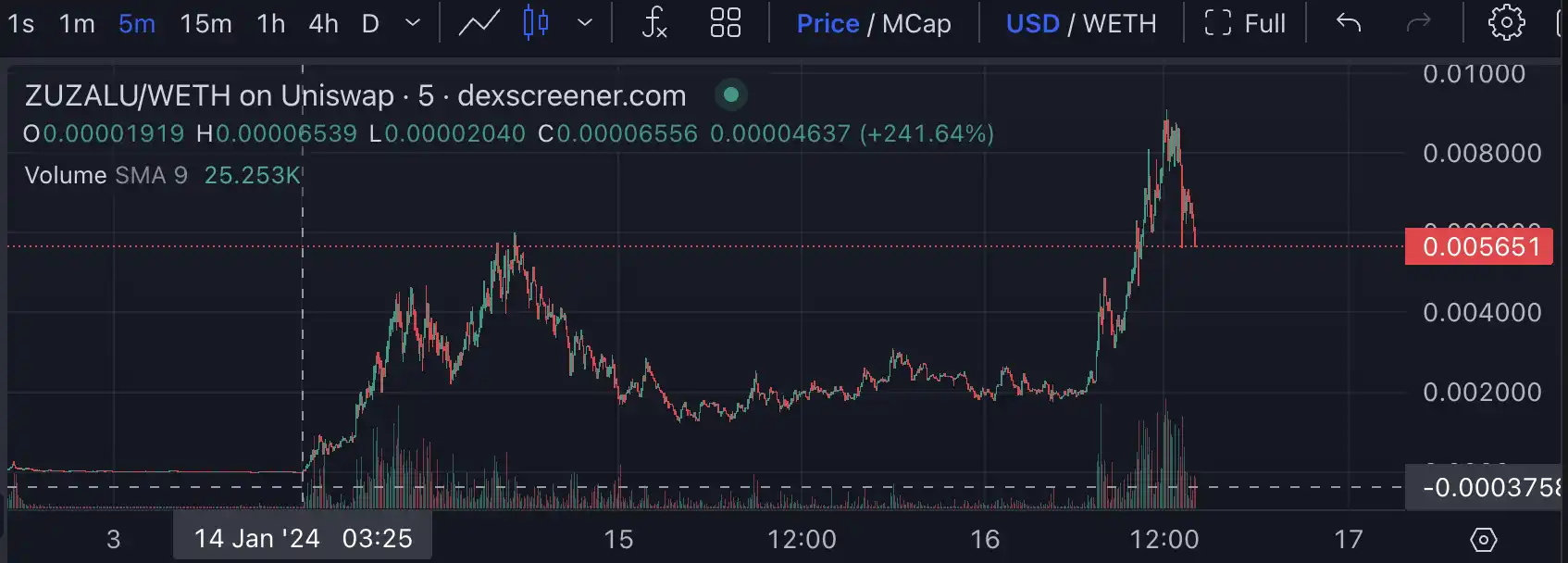 截至撰稿时,ZUZALU 价格为 0.0056 美元,24 小时涨幅 197%,市值为 570 万美元。