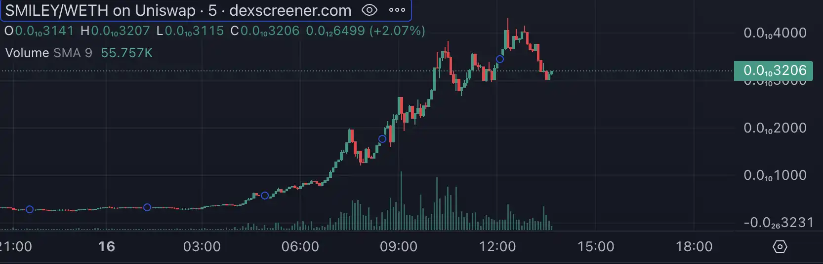 截至撰稿时,SMILEY 价格为 0.0(10)31 美元,24 小时涨幅 895%,市值为 1340 万美元。