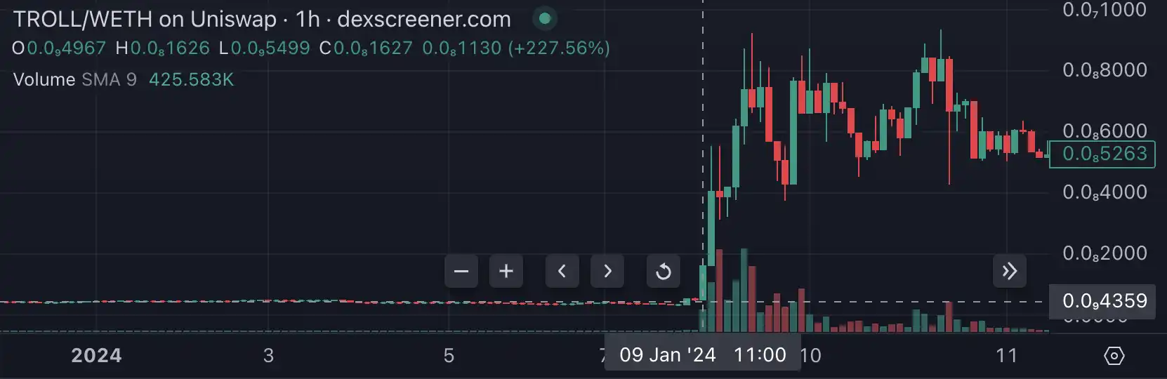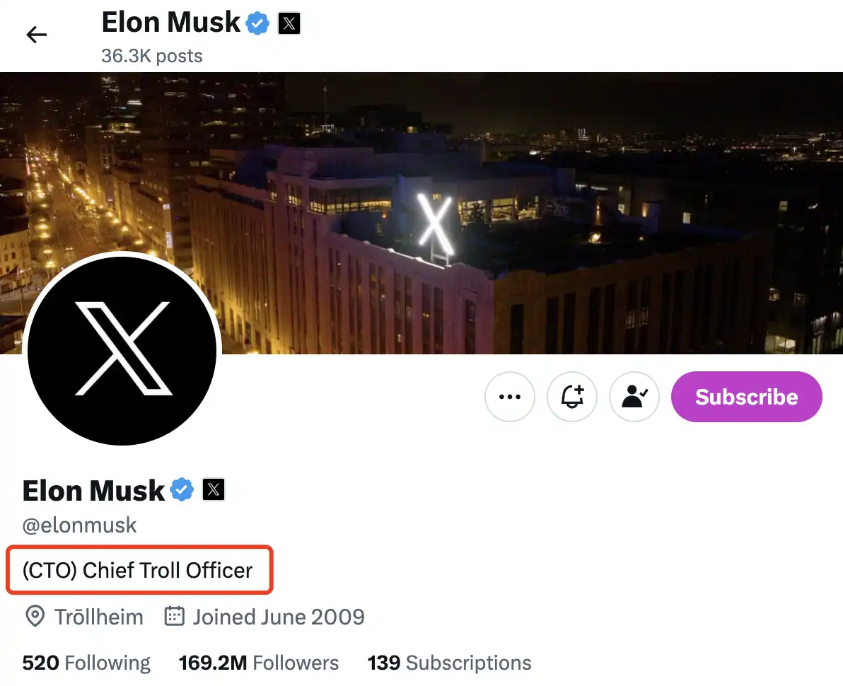 2024 年 1 月 9 日,马斯克将自己的推特个人介绍变成了 (CTO) chief Troll Officer,随后 TROLL 币价飙升。