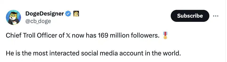 1 月 13 日,Doge 币的 UX/UI 和图形设计师 @cb_doge 发布推文带上了马斯克的新简介,「X 的首席巨魔官现在拥有 1.69 亿粉丝」再一次推高炒作情绪。