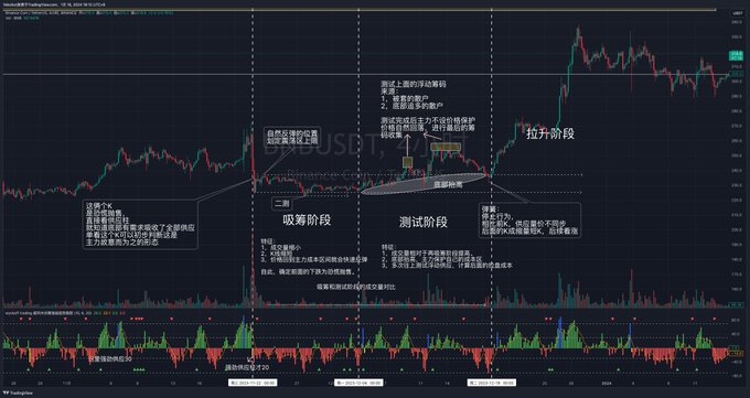 现在读盘用 BNB 4 小时时间周期举例,BNB260-220 恐慌抛售后的再吸筹是一个经典案例,适合反复研读,他走出来了尽可能多的吸筹阶段所有的形态,我在 220-230 区间时候开始进行买入,可以搜索关键词 yekoi bnb,查看以前的推文。
