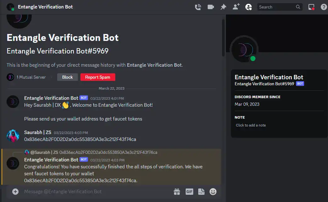 2. 进入 #faucets 子频道,单击验证。随后在左上角看到 DM 弹出窗口。单击 DM,将钱包地址粘贴到 Faucet 代币机器人中,然后发送消息。如果您已经添加了 Entangle Testnet 网络并收到了 faucet 代币,那么您就可以参与 Entangle Testnet 了。