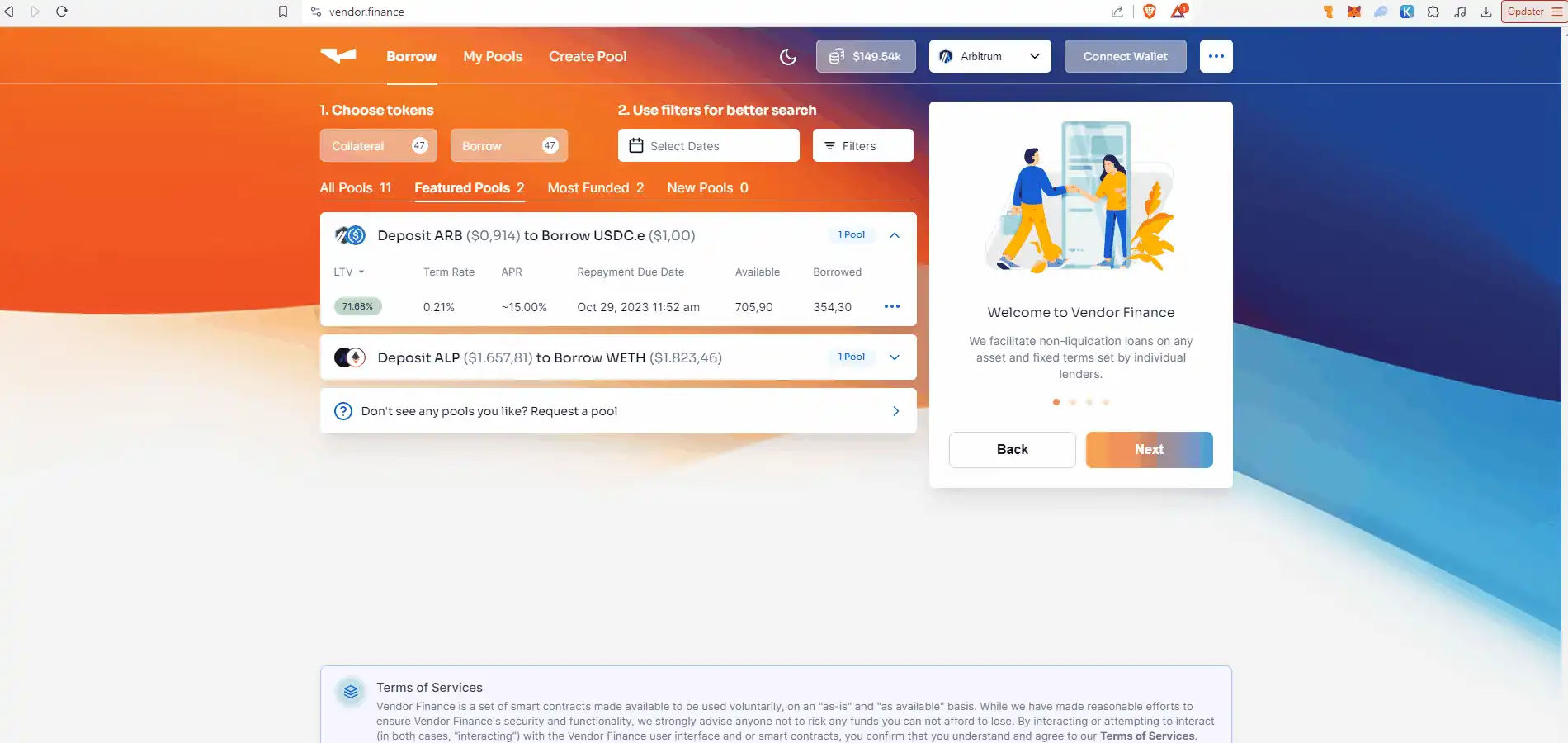 4. 打开Vendor Finance,连接钱包并选择 Mantle Testnet 网络。选择 FMDUC 池并输入所需数量的 Liquid Vault 用作抵押品,批准交易并确认,这样就使用 Liquid Vaults 作为抵押品成功借入了 USDC。