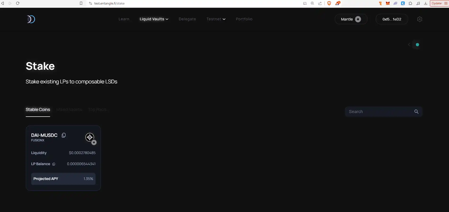 3. 返回官网页面,在确保链接钱包后,从 Liquid Vaults 下拉列表中选择 Stake 选项,并选择 Mantle 测试网网络。选择一个池子并选择想要质押的 LP 代币数量。批准并确认交易,作为回报,您将获得 Liquid Vaults。