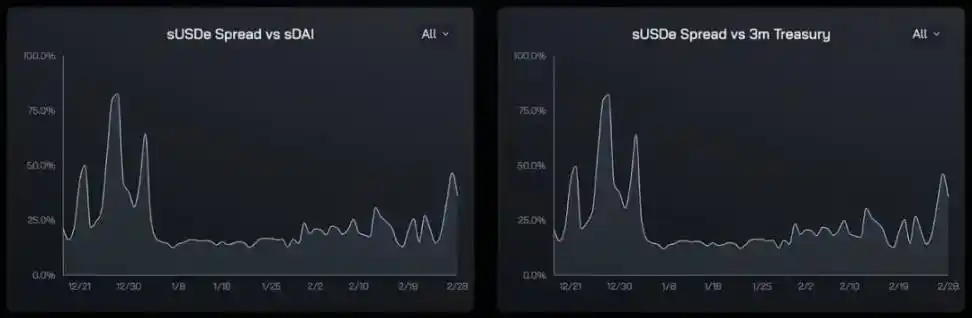 如您所见,sUSDe(托管 USDe)的收益率远远高于 sDAI(托管 DAI)和 1 个月美国国债。
