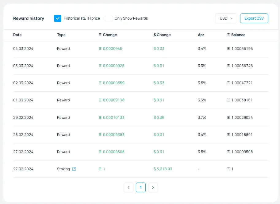 我们可以看到 stETH 的收益每天都会自动更新,下图是我们测试的收益情况,对应每天都可以检查加密钱包验证相关内容。