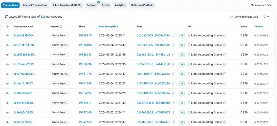 我们继续看代码, _getTotalPooledEther 中的逻辑是会受到 handleOracleReport 方法影响,而这个方法则会更新合约中的相关数据。具体的调用是会通过 https://etherscan.io/address/0x852deD011285fe67063a08005c71a85690503Cee 合约定期调用 submitReportData 更新数据(submitReportData 中会调用 Lido 合约的 handleOracleReport):
