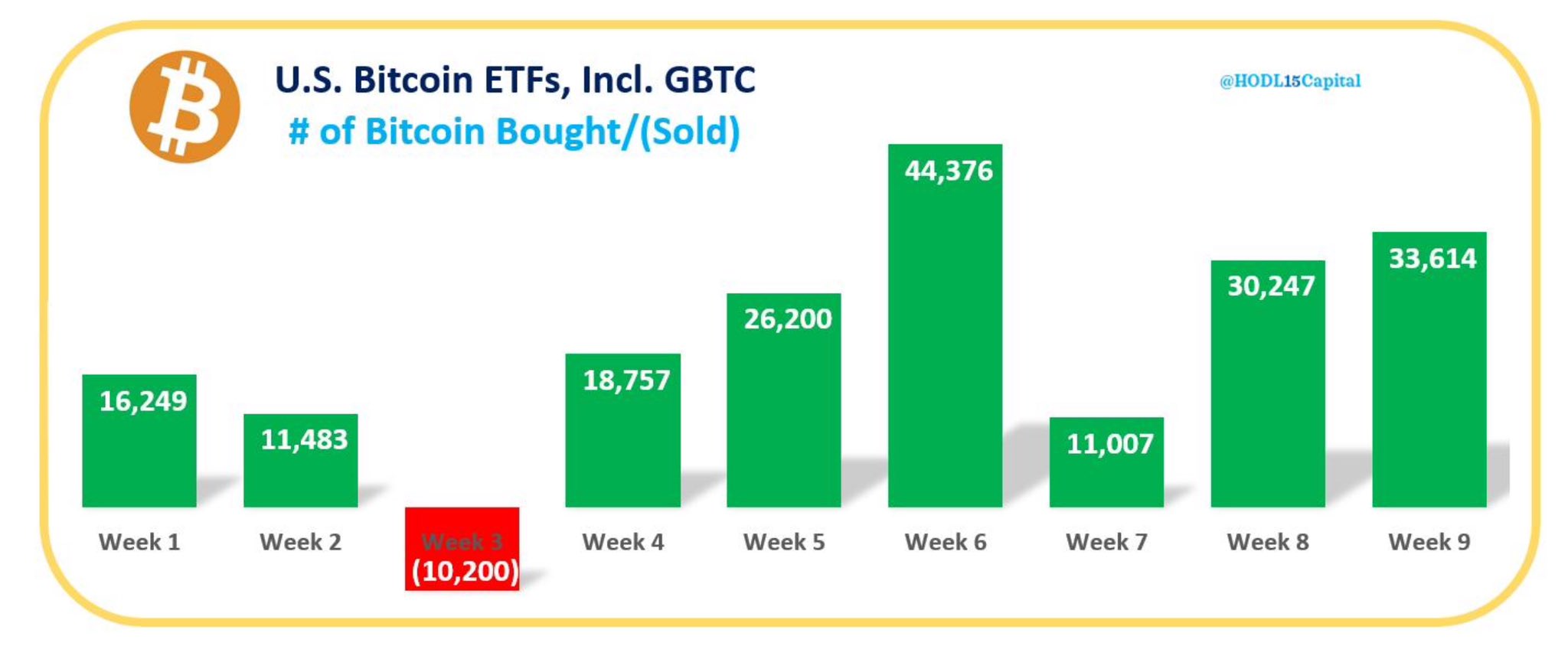 根据HODL15 Capital的数据,现货比特币ETF上周共积累了33000 BTC(23亿美元),其中包括Grayscale的GBTC基金,该基金流出了超过10200 BTC。