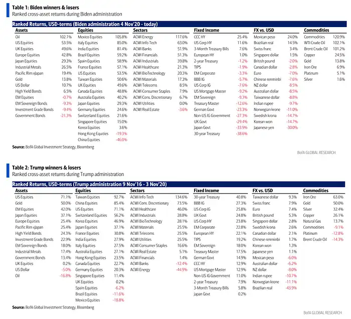 历史上拜登和特朗普当选时期表现最好的资产,里面没有加入 BTC,BTC 在拜登时期涨幅是 400%,在特朗普时期涨幅是 1900%,有趣的是原油、美元、南美股市、亚洲股市、债券的回报在两位总统执政期间几乎是完全相反的: