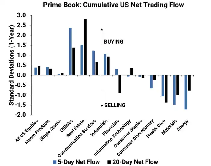 根据高盛 PB 统计口径,美国股市连续第二周出现净买入,多头买入量超过空头卖出量,比例约为 1.6 比 1。净买入最多的行业是通信服务、工业、公用事业和房地产。净抛售最多的行业是能源、医疗保健、非必需消费品和材料。通信服务上周出现五个多月以来最大的名义净买入+1.2 个标准差。