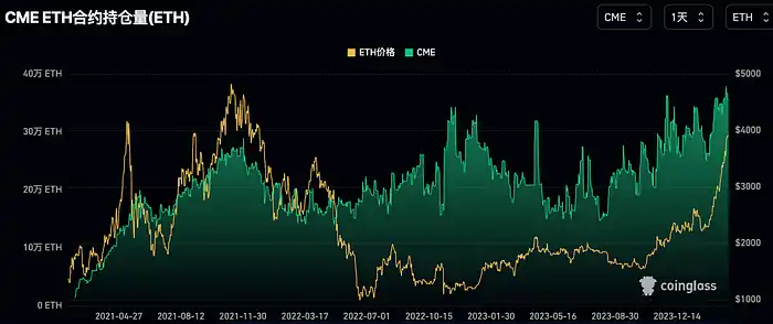 以太坊 ETH 的 CME 持仓量币本位在上周也刷新历史新高,显示华尔街资金确实有意参与下一个实物 ETF 的博弈之中。不过创新高的幅度比起 BTC 来说逊色不少。