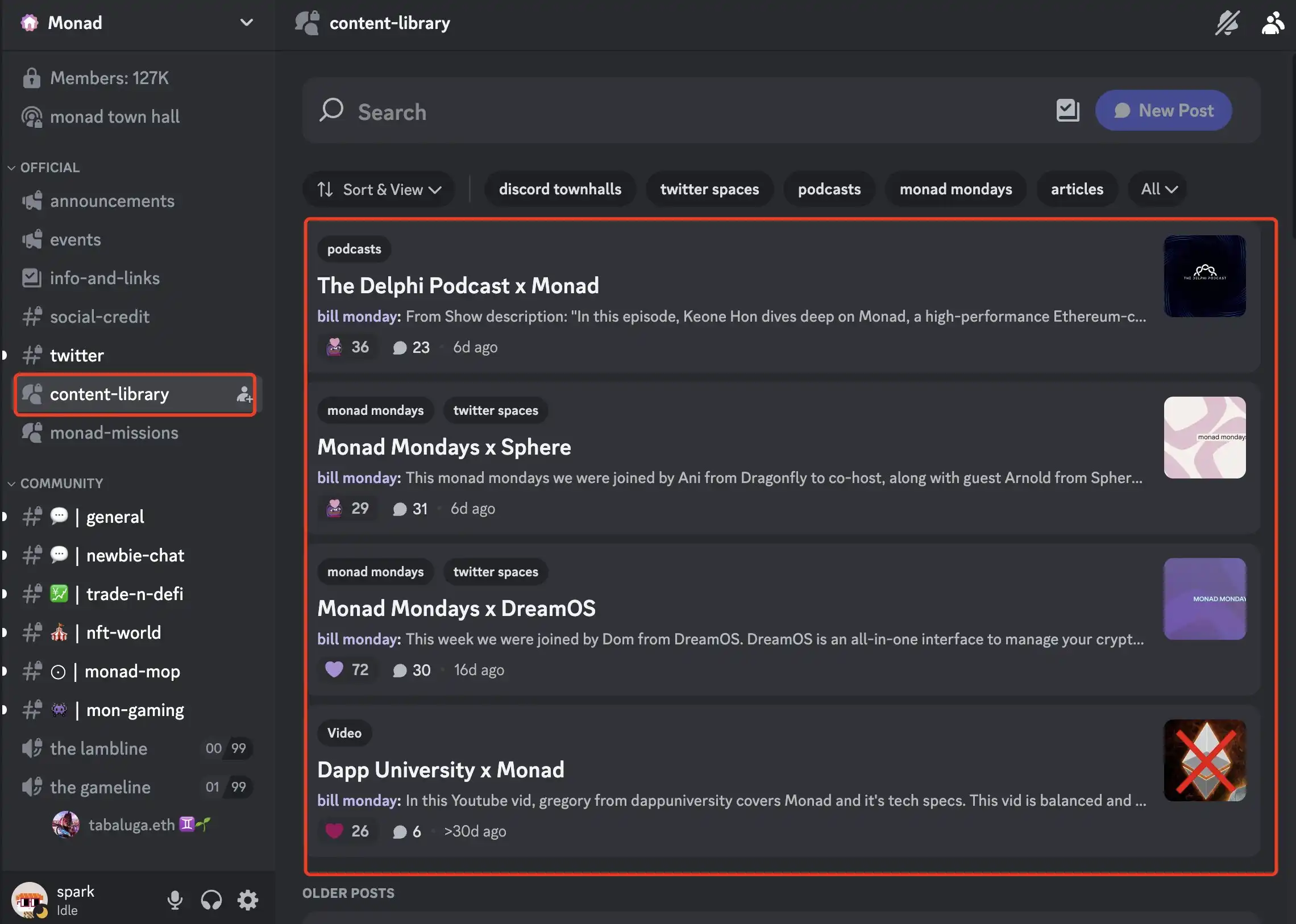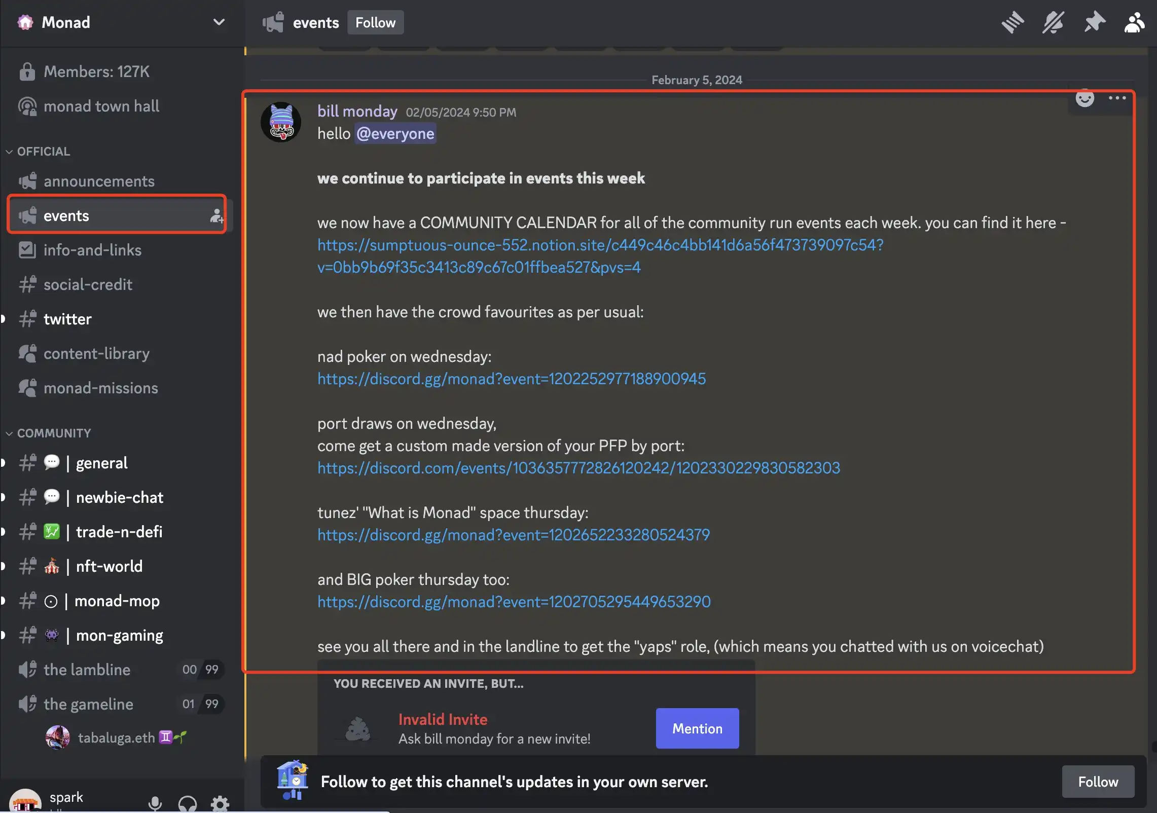 这里注意需要是有质量的聊天,比如讨论技术,币圈实时信息,一些幽默的对话等等,在社区让更多的人看到你!大部分用户都在 general 频道聊天,你可以选择在那里加入他们!比如 Gmonad 就是从社区开始的,大家也都喜欢说 GMonad,而不是 GM。