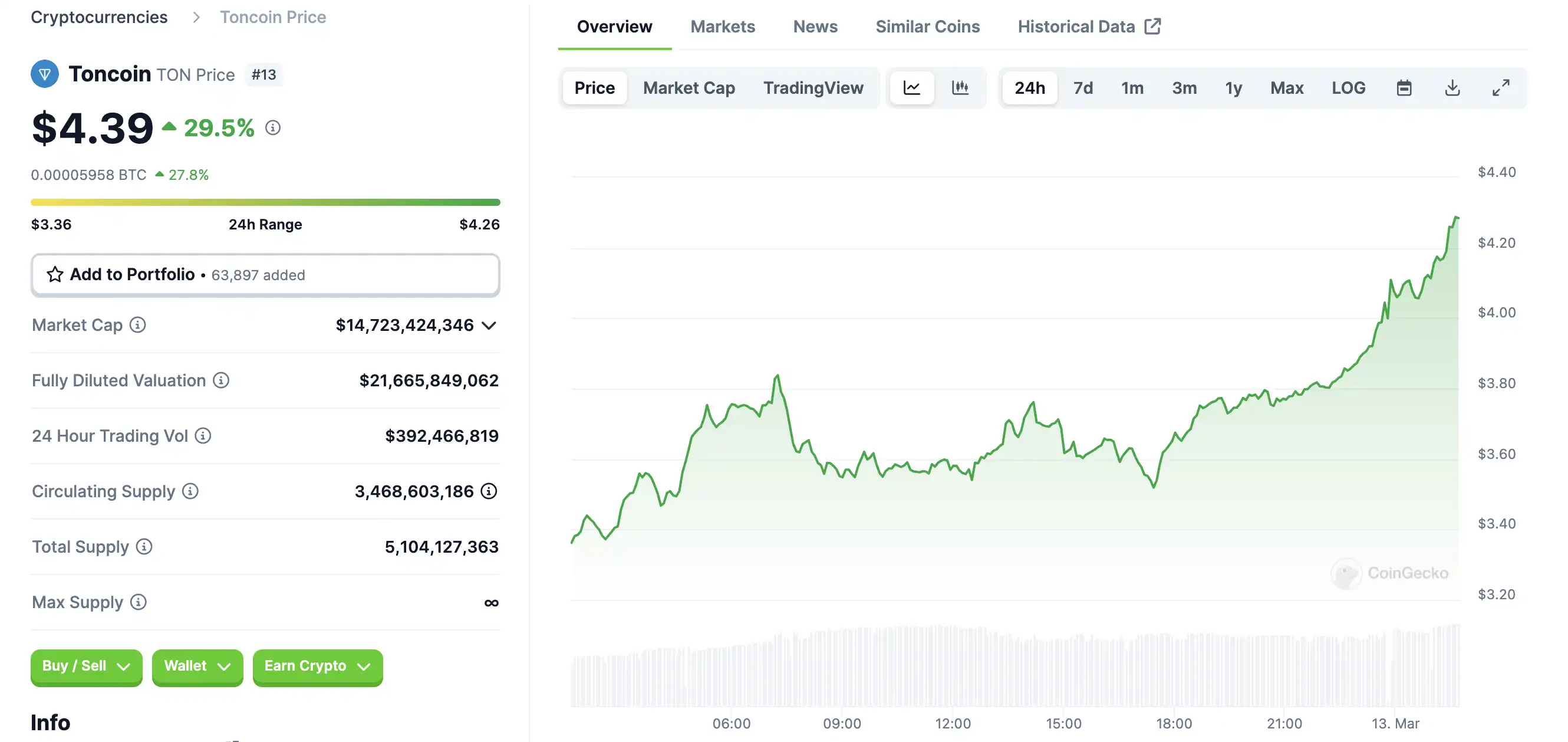 消息公布后,TON 短时涨超 27%,截至撰稿时,其价格为 4.39 美元,24 小时涨幅达 29.5%。