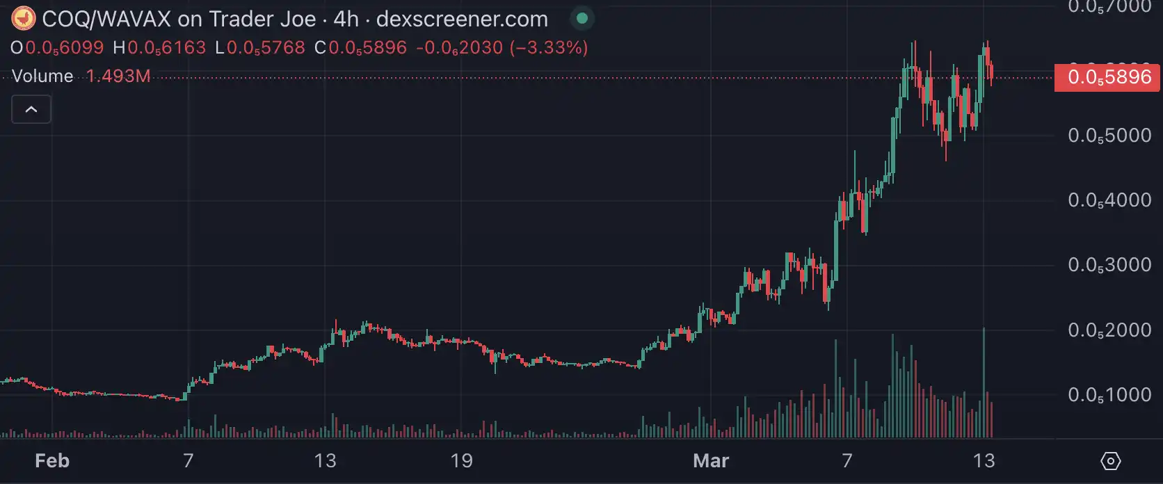 和 Near 情况一样,Avalanche 上的 meme 币也复活了,COQ 自底部已上涨超 300%。截至撰稿时,COQ 价格为 0.0(5)58 美元,24 小时涨幅达 3%。