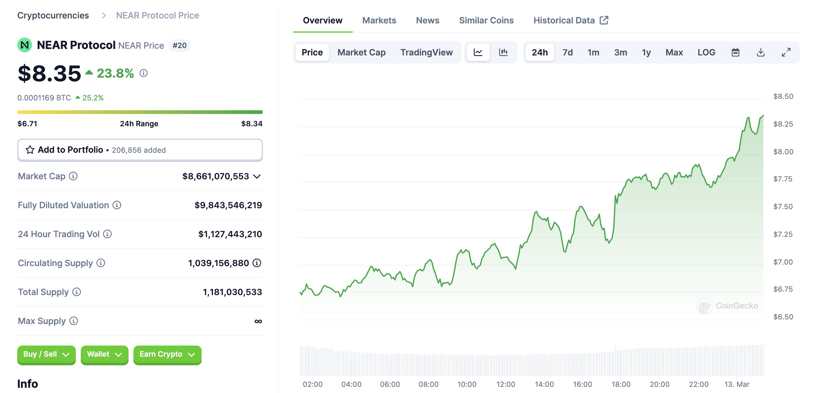 NEAR Protocol 联合创始人 Illia Polosukhin 宣布将在 3 月 20 日 GTC24 大会期间出席「Transforming AI」主题演讲及小组讨论活动,英伟达创始人黄仁勋也将参加该场次活动。这个消息公布后,NEAR 短时突破 5 美元,截止撰稿时已经突破 8 美元。