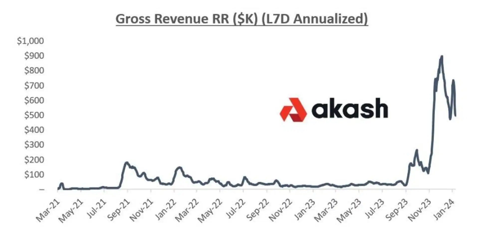 Akash Network 的核心价值在于其作为一个去中心化计算平台,利用了全球未被充分使用的 GPU 资源,连接了这些资源与需要 GPU 计算能力的用户之间。这一平台不仅为 GPU 资源的所有者提供了盈利机会,也为需要这些资源的用户提供了成本效益更高的选择。根据 2023 年 9 月的数据,Akash Network 已经在其网络上成功部署了 150 至 200 个 GPU,并实现了 50% 至 70% 的利用率。这一成绩在年总交易价值上体现为 50 万至 100 万美元,展示了去中心化计算资源共享模型的市场潜力。