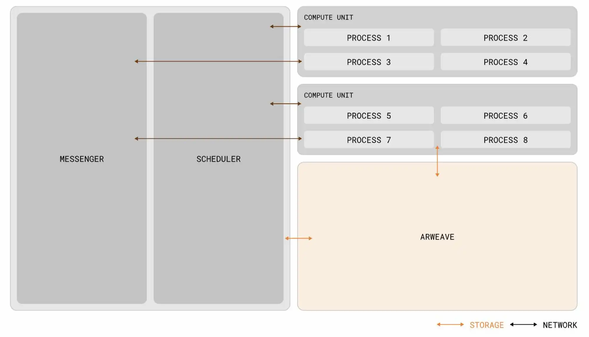 Arweave 推出的 AO 方案代表着区块链技术的一个重大创新,主要体现在其提供的超并行计算机架构上。这个架构允许在去中心化的计算环境中同时并行运行任意数量的进程,极大地提升了计算效率和扩展性。AO 的核心特点包括大规模计算能力、可验证计算的实现、以及通过构建三个不同的子网络(信使单元、调度单元、计算单元)和以 Arweave 为基础层,实现的高度并行处理能力和可扩展性。