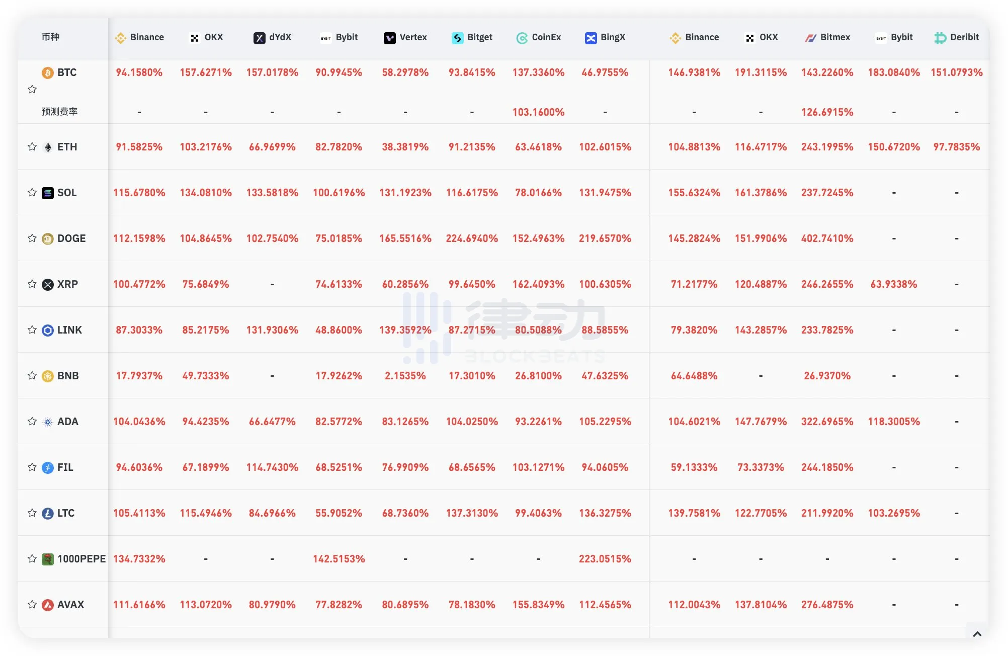 另一方面,据 @cheng_shutong,从合约资金费率可以看到,大部分山寨币的费率已经到达了年化 100% 甚至更高,说明大部分的散户,在比特币和以太坊接连突破新高的刺激下,都在搏山寨的集体补涨行情。