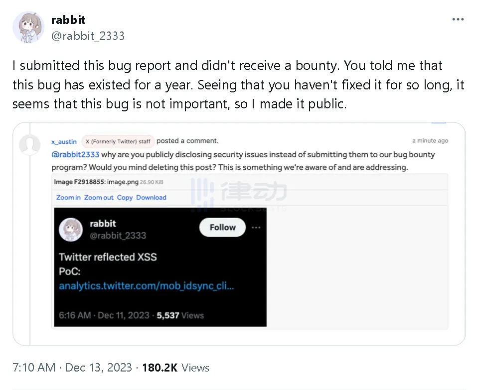 Chaofan Shou:Blaz+不仅在链上会进行实时形式化验证与模糊测试,还会实时分析 Twitter 等社交媒体中的舆情信息。Blaz+帮助我们监测到了 Twitter 用户 @rabbit_2333 发推提到的 Twitter 不予修复的漏洞,在之后我们的研究下将这一发现变为了一个高危漏洞。